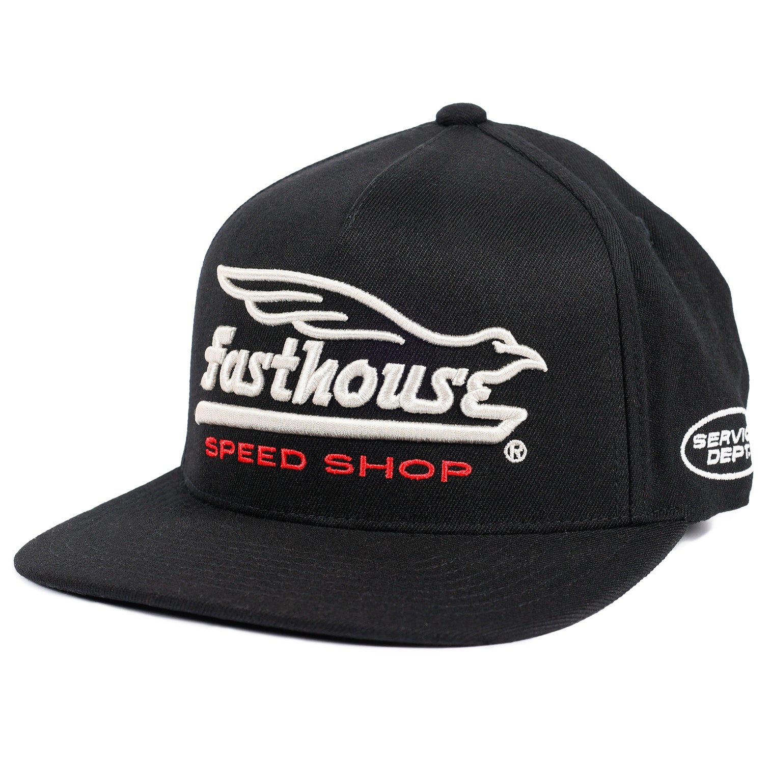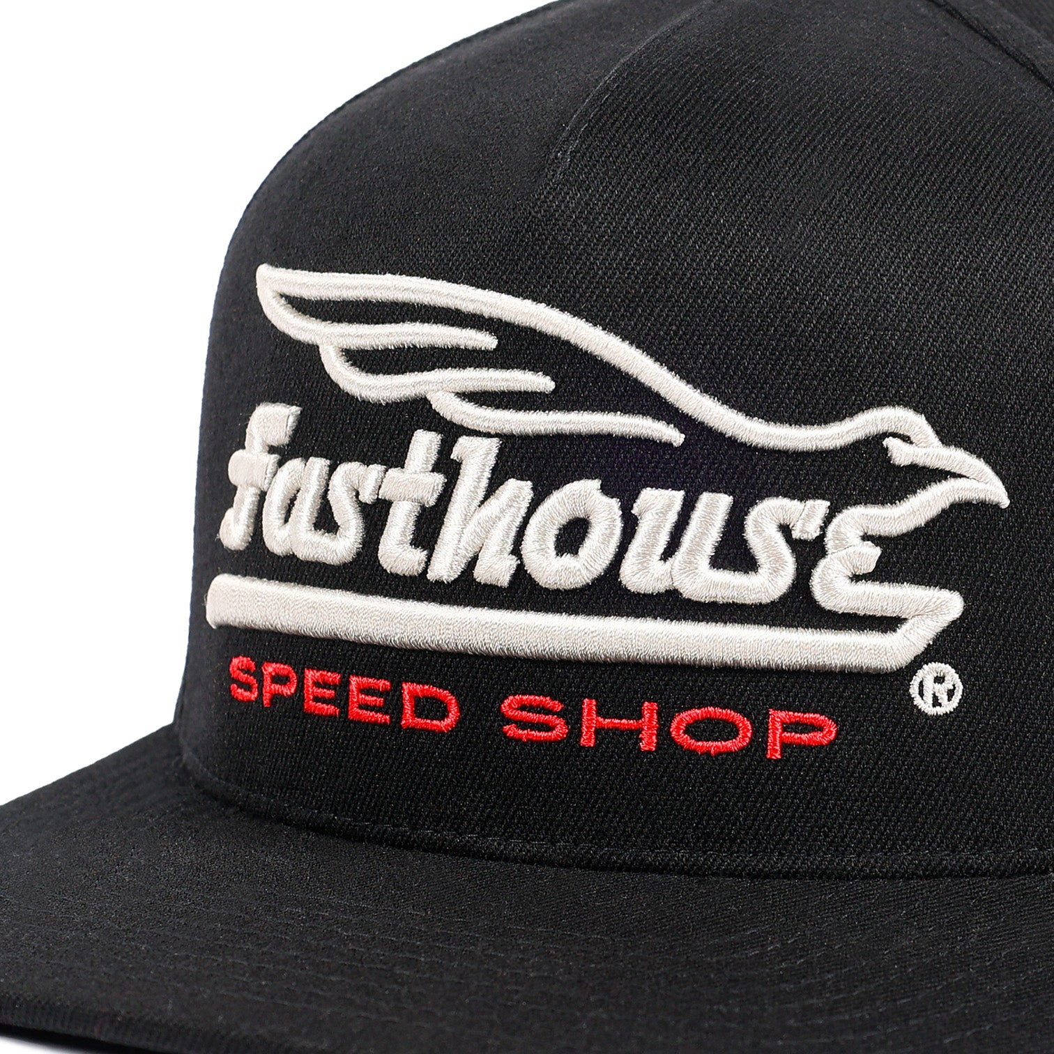 The Fasthouse Gilmore Hat is a high-profile 5-panel snapback built for a bold look and comfortable fit. Made from a premium acrylic-wool-spandex blend, it features oversized embroidered front artwork, a 110 Flexfit tech sweatband, side logo embroidery, and custom interior and exterior trims for all-day wear on or off the bike.