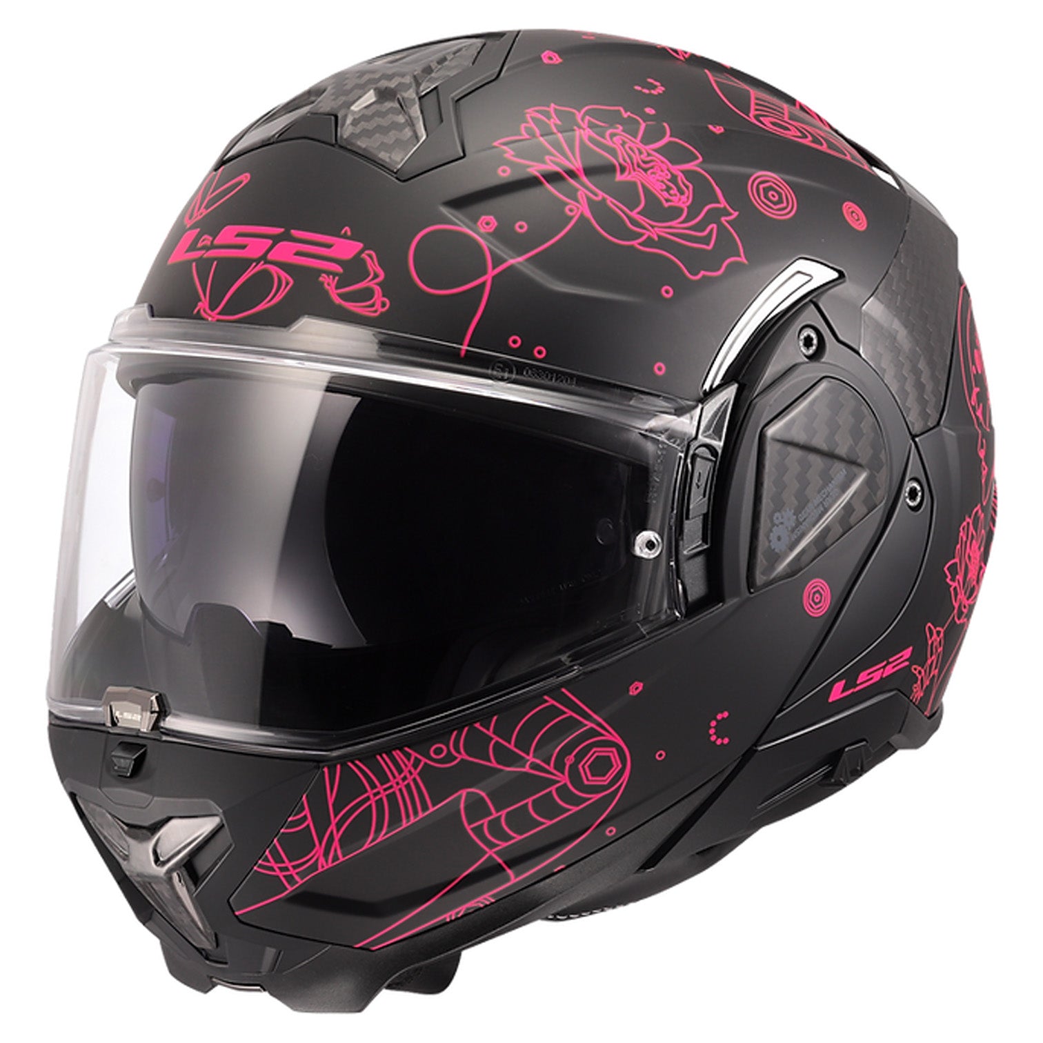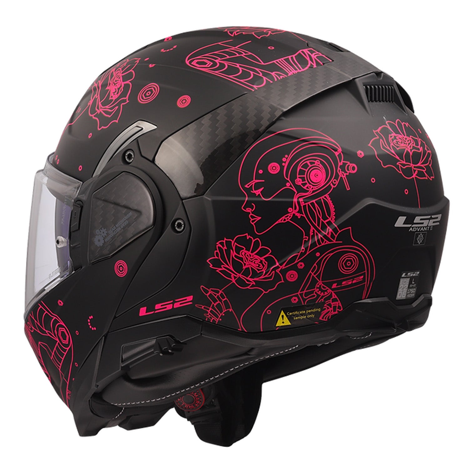 LS2 Helmets Advant II Sophia Helmet Matte Pink/Black - Front Left Side View with Chin Bar Rolled Back and Faceshield Raised