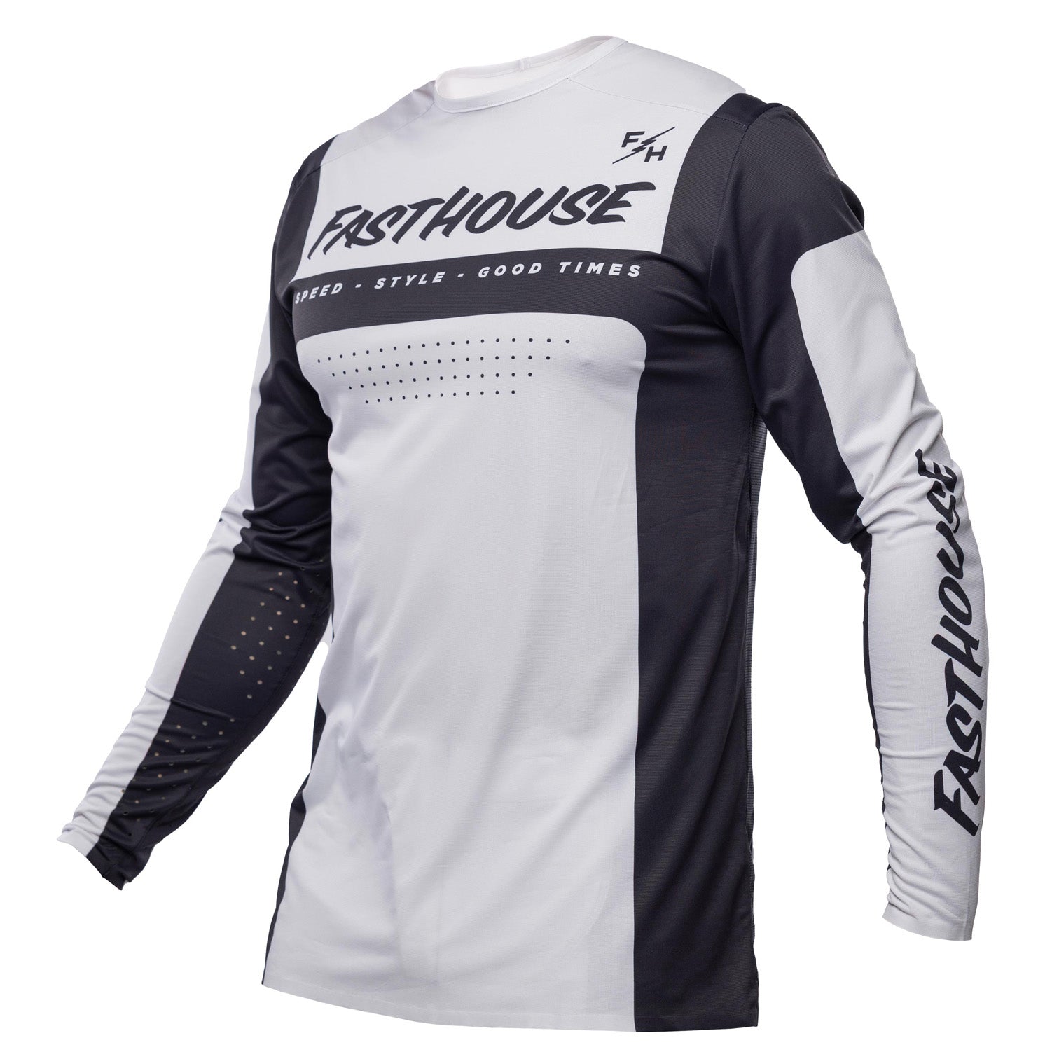 Fasthouse Helix Monaco Jersey Black/White - Close-Up Angled View of Front Graphics