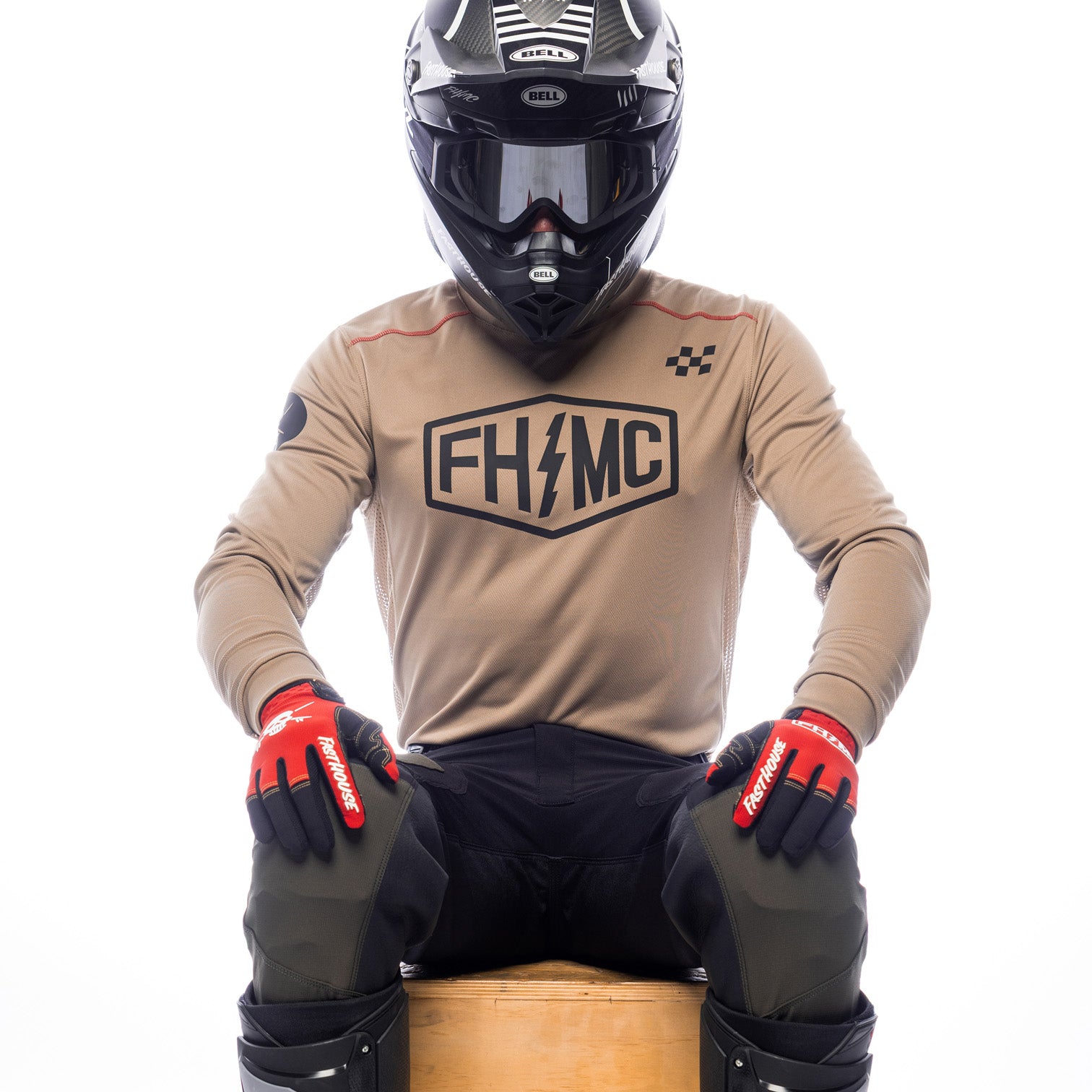 Fasthouse Sanguaro Bennet Jersey Vintage Gold - Front View of Model Sitting While Wearing Jersey
